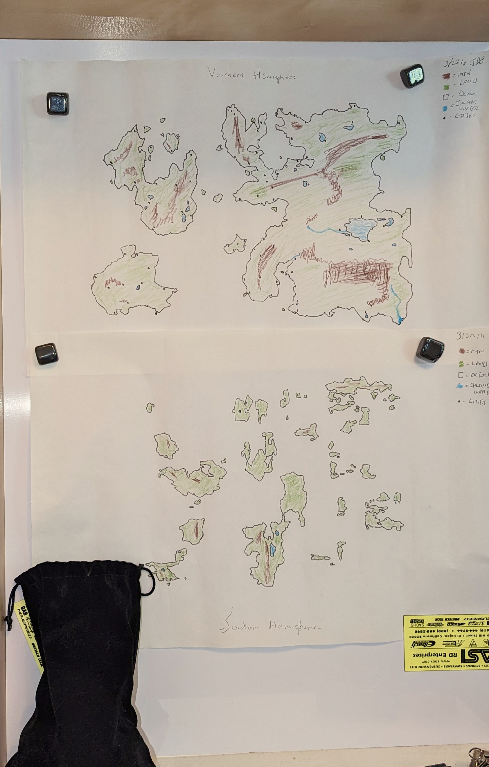 The bag at the bottom is the collection of role playing dice I used to create the map. I rolled them out and traced around them to create continents and islands, then filled in the terrain. Some of it matched the story idea I was developing, but a lot of it didn’t and impacted things as they moved along.