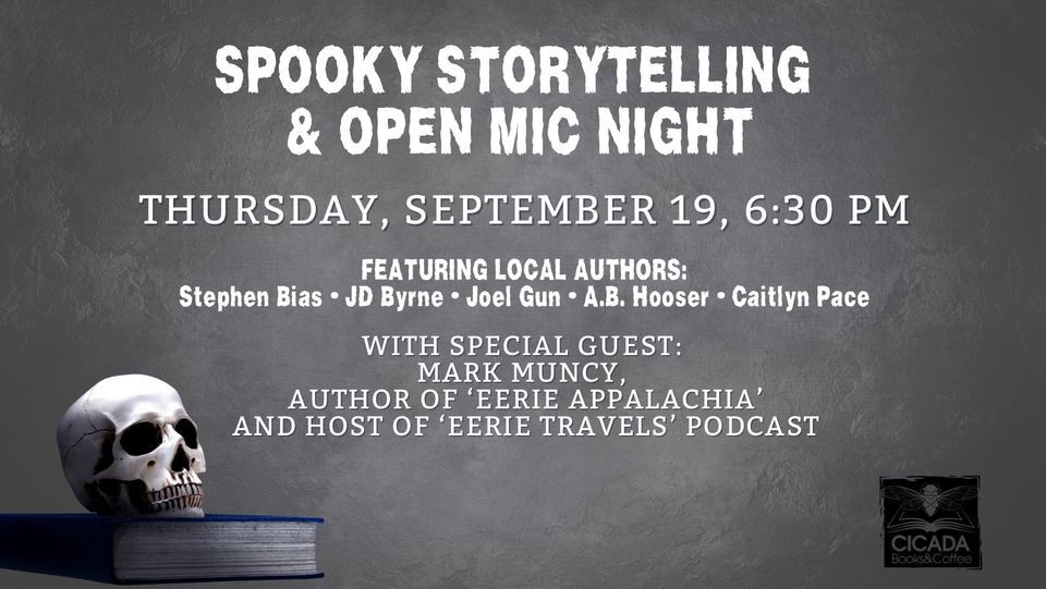 I’ll bust out some of my scarier stuff, along with other local authors Stephen Bias, Joel Gun, A.B. Hooser and Caitlyn Pace, along with podcaster Mark Muncy. It’s open mic, too, so bring your best spooky tale! More details here.
