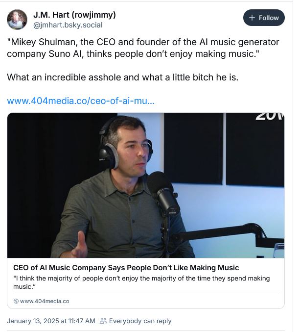 Reading further didn’t make things any better. I had thought, perhaps, that what Shulman meant when he said people don’t like making music these days was something about how creators have to spend so much time doing other stuff (building brands, being terminally online, etc.) that “making music” in a business sense is not as fun as it once was. He was talking about professionals, in other words.