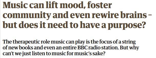 Where the art-for-art’s-sakers and the music-for-healing camps find common ground is in the idea that as a society we’ve lost sight of how important music is. Over the past decade, there’s been a sharp decline in UK sixth-formers studying the arts, following the government’s “strategic priority” emphasizing Stem subjects. But music is not the icing on the cake of an existence dominated by science, technology and economics; it’s (to push a metaphor too far) the rich butter whipped right through the mix. We are aural creatures, reverberating together.